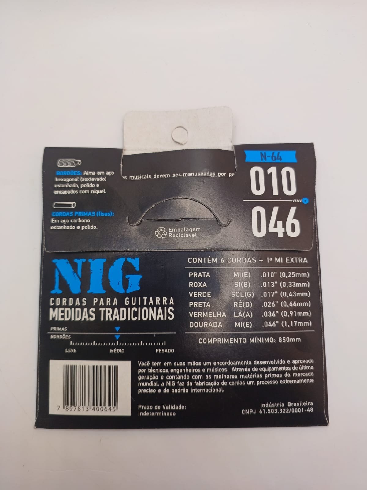 O pacote identifica as cordas por cores, o que facilita na hora de instalá-las na guitarra. As medidas de cada corda são as seguintes: