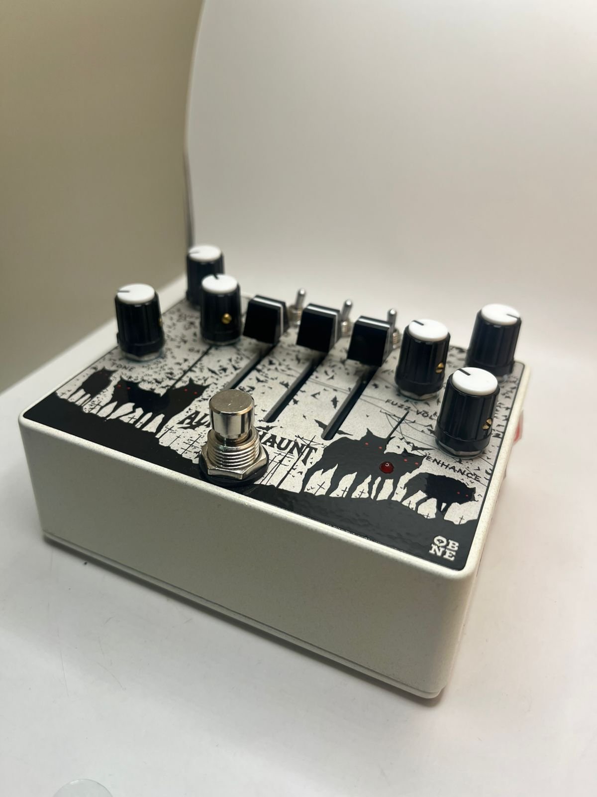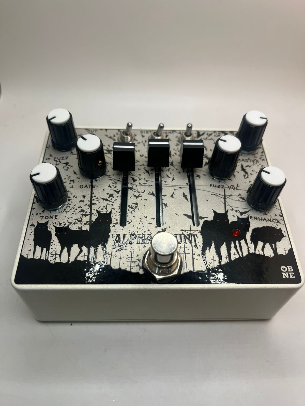 O pedal é o modelo Alpha Haunt Fuzz, um pedal de fuzz versátil e de alto ganho conhecido por seus amplos controles de modelagem de tom e opções de gate.